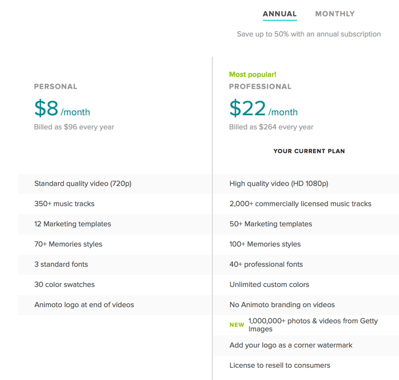 Here is an Animoto review – pricing plans comparing the personal and professional options. For an annual plan, the personal option is $8 per month and the professional option is $22 per month. Double that if you want to only purchase one month at a time.